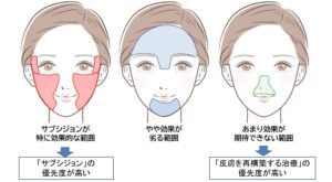 陥凹瘢痕の治療は「①深部の瘢痕を切離する(サブシジョンなど)」と「②皮膚を再構築する」の大きく2つの方法があります。そのため、こめかみ、頬、フェイスラインでは優先度が「①>②」であり、鼻、白唇部では優先度が「①<②」になります。