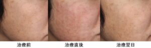 赤み、腫れ、点状出血、かゆみが数日続き、多くの方は1週間ほどでかさぶたがなくなります。まれですが炎症後色素沈着、水疱形成、毛嚢炎が起こることがあります。ダウンタイムを軽減するために弱めに照射することも可能であるためご希望の方はお申し付けください。
