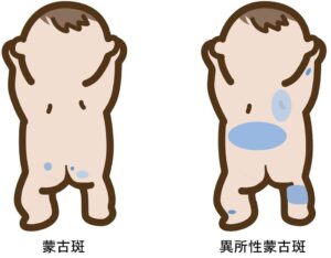 お尻、腰に見られる青あざを蒙古斑といいますが、これら以外の部分にできた蒙古斑を異所性蒙古斑といいます。蒙古斑は日本人の乳幼児のほぼ100%に認めます。胎児期には真皮にメラノサイトというメラニンを作る細胞が存在しますが、通常は生まれてくるまでにメラニンは消失します。しかし、何らかの原因で真皮にメラニンが残存すると蒙古斑や異所性蒙古斑になります。