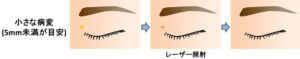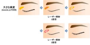 この方法は治療期間が長くなること、1回目の施術から2回目の施術までキズ跡と病変が混在したやや違和感のある外観になることが欠点です。また、キズ跡がきれいに治りやすい顔やまぶたにのみ行うことができる治療法で、体や手足の病変に行うことはできません(目立つキズ跡になります)。
