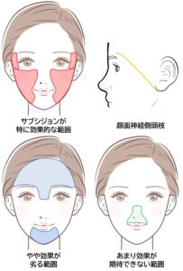 サブシジョンは特にこめかみ、頬、フェイスラインに有効です。ただし、こめかみには顔面神経側頭枝という重要な神経が走行しているため、神経を損傷しない範囲かつ損傷しない層で剥離を行います(解剖を熟知している医師が行えば神経を損傷する可能性は極めて低く、当院でもこれまで顔面神経側頭枝麻痺の発生は一例もありません)。