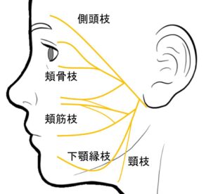 耳の後方の茎乳突孔から頭蓋骨の外に出てきた顔面神経は耳下腺内を走行し、側頭枝、頬骨枝、頬筋枝、下顎縁枝、頸枝の5つに分岐します。