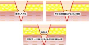 外傷によって顔面神経が切断されたときは、顕微鏡下で切断された神経を縫合することにより回復が期待できます。神経を直接縫合することができないときは、他の部位からの神経移植(下腿にある腓腹神経という感覚神経などを用います)や、人工神経を用いて再建します。神経を採取した部位は知覚低下(感覚が鈍くなること)を生じますが、日常生活には支障ありません。