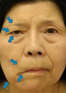 眉毛が下がることに加え、上まぶたの皮膚も下垂することにより視野が狭くなります。しかし、通常の眼瞼下垂と異なり、顔面神経麻痺の方は目を閉じる機能も低下しています。結果として、視野は狭いけど、目も閉じにくいという相反するような症状が出現します。